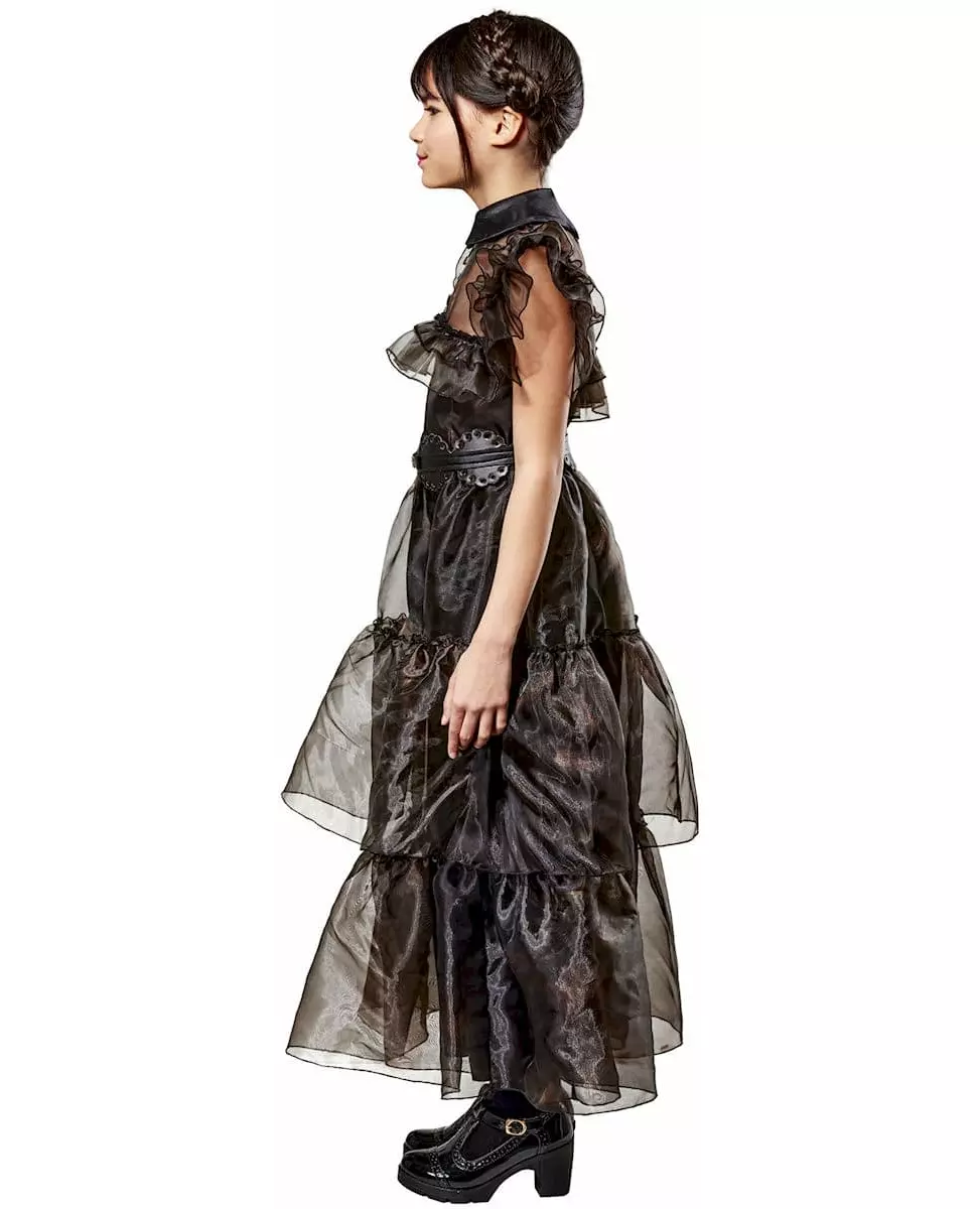 Den uforlignelige Wednesday Addams™! Dette ballkostymet er offisielt lisensiert av Wednesday Addams™. Det inkluderer en kjole og et belte. Kjolen er lang og svart. Den har rysjer og er laget av fløyelsstoff med satengeffekt. Ermene er korte og dekorert med en fløyelskant som går ned til brystet. Den lille, svarte kragen gir et mer originalt preg. Beltet vil fremheve midjen din. Med svarte ankelstøvletter og flettet hår vil du forvandle deg til Wednesday Addams™! Perfekt til for eksempel en Halloween-kostymefest! Inkludert tilbehør: Kjole Belte Materiale: 100 % polyester Pleie: Håndvask