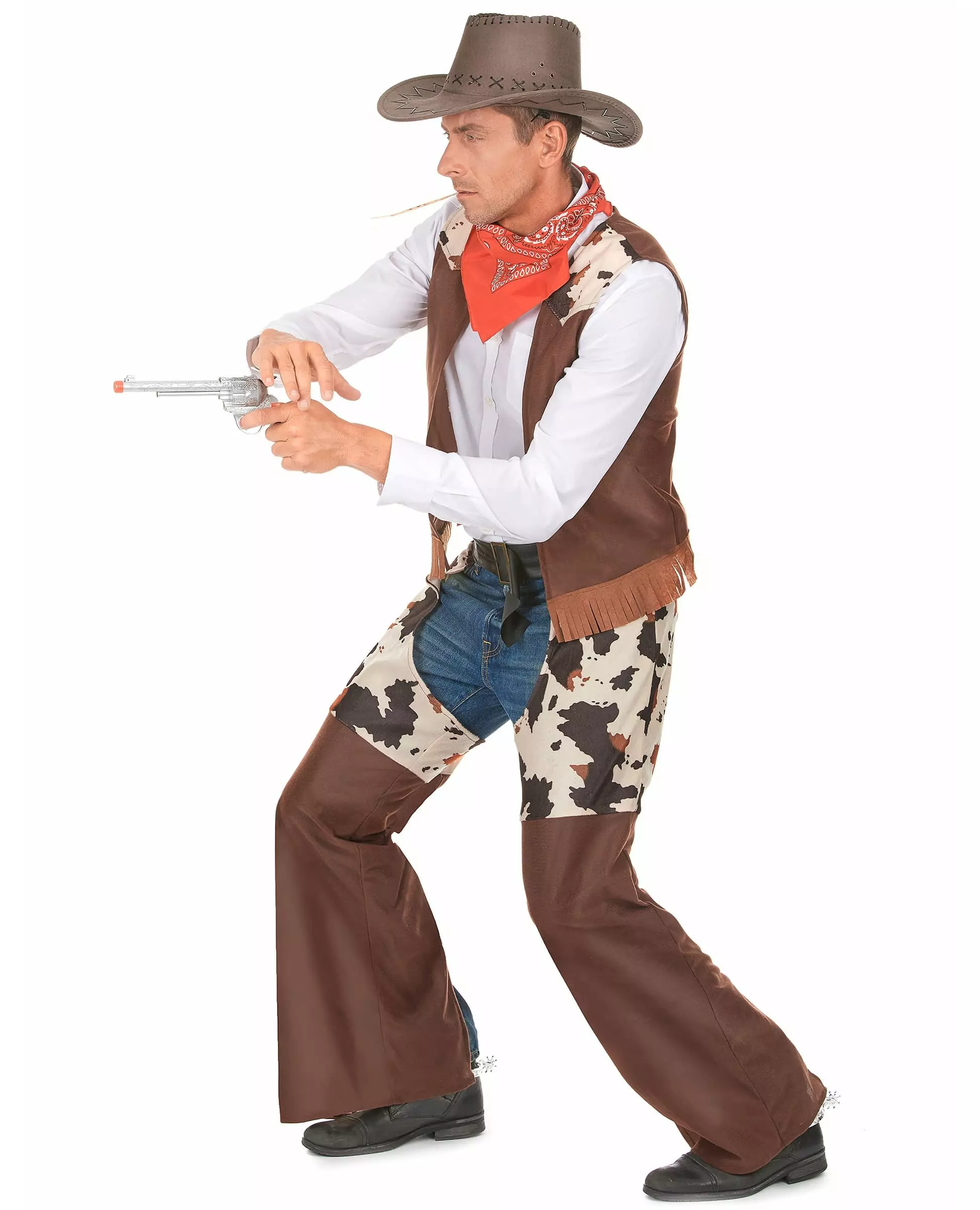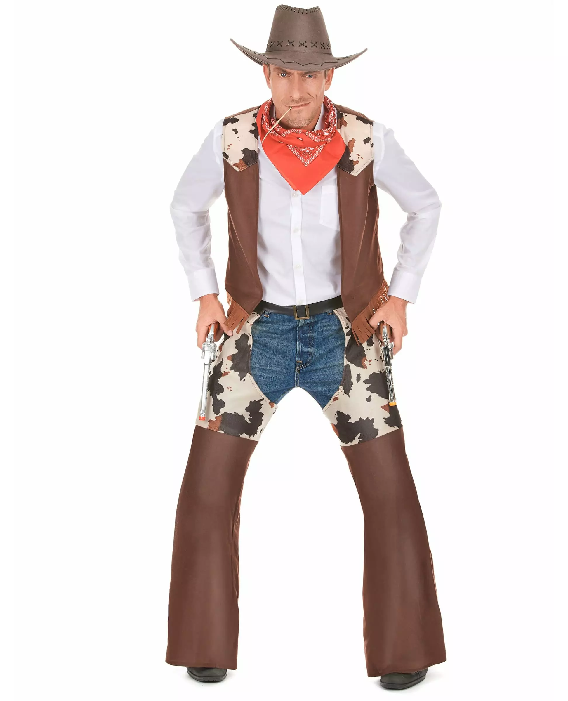 Det er opp til deg å være raskest til å tegne! Dette cowboykostymet for menn inkluderer en vest og overbukser. Vesten er ermeløs med frynser nederst. Skuldrene vil være dekket av et mykt stoff med kuskinntrykk. Chapsene vil bli plassert over jeans. Et svart belte i imitert skinn med metallspenne lar deg tilpasse det til kroppsfasongen din. Toppen har kuskinntrykk, bunnen av chapsene er brun foran og svart "imitert skinn" bak. Dette vakre kostymet vil være perfekt for å spille en ekte Vill Vest-cowboy på et kostyme eller en temafest. Inkludert tilbehør: Vest-chaps Materiale: Polyester Stell: Håndvaskbar