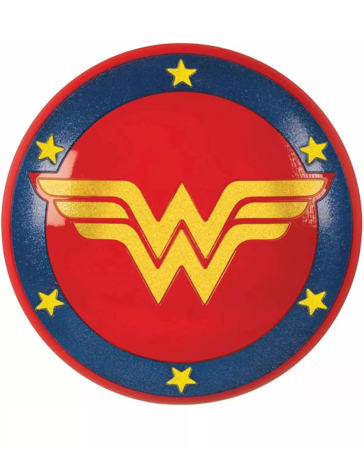 Wonder Womaaaan! Dette barneskjoldet er offisielt lisensiert av Wonder Woman®. Det er laget av rød og blå PVC, innlagt med stjerner og logoen til superhelten Wonder Woman® i gull. Det måler omtrent 33 cm i diameter. Skjoldet har et håndtak på baksiden for å gjøre det lettere å holde. Det vil være perfekt som tilbehør til datterens Wonder Woman-kostyme til en utkledd bursdagsfest, for eksempel! Inkludert tilbehør: Skjold Materiale: Plast
