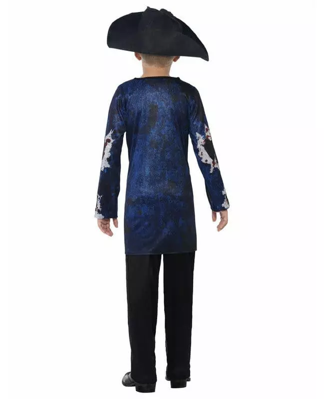 Alle om bord, sjømenn, zombiene kommer! Dette piratzombiekostymet for barn består av en tunika, bukser og en hatt (sabel, linser og sko er ikke inkludert). Den midnattsblå tunikaen har lange ermer og er enkel å ta på ovenfra. Den er trykt for å skape en illusjon med en revet skjorte, et piratbelte og et brystkasse som drypper av blod. Innvollene er også synlige for å skremme alle forbipasserende; barnet ditt vil garantert bli lagt merke til. De mørkegrønne og svarte buksene avslører også bein og blod for en garantert zombieeffekt. Den svarte hatten vil fullføre dette udøde piratutseendet. Barnet ditt vil se perfekt ut denne Halloween i dette fantastiske, realistiske zombiepiratkostymet for barn. Inkludert tilbehør: Tunikabukser Hatt Materiale: 100 % polyester Vedlikehold: Håndvask
