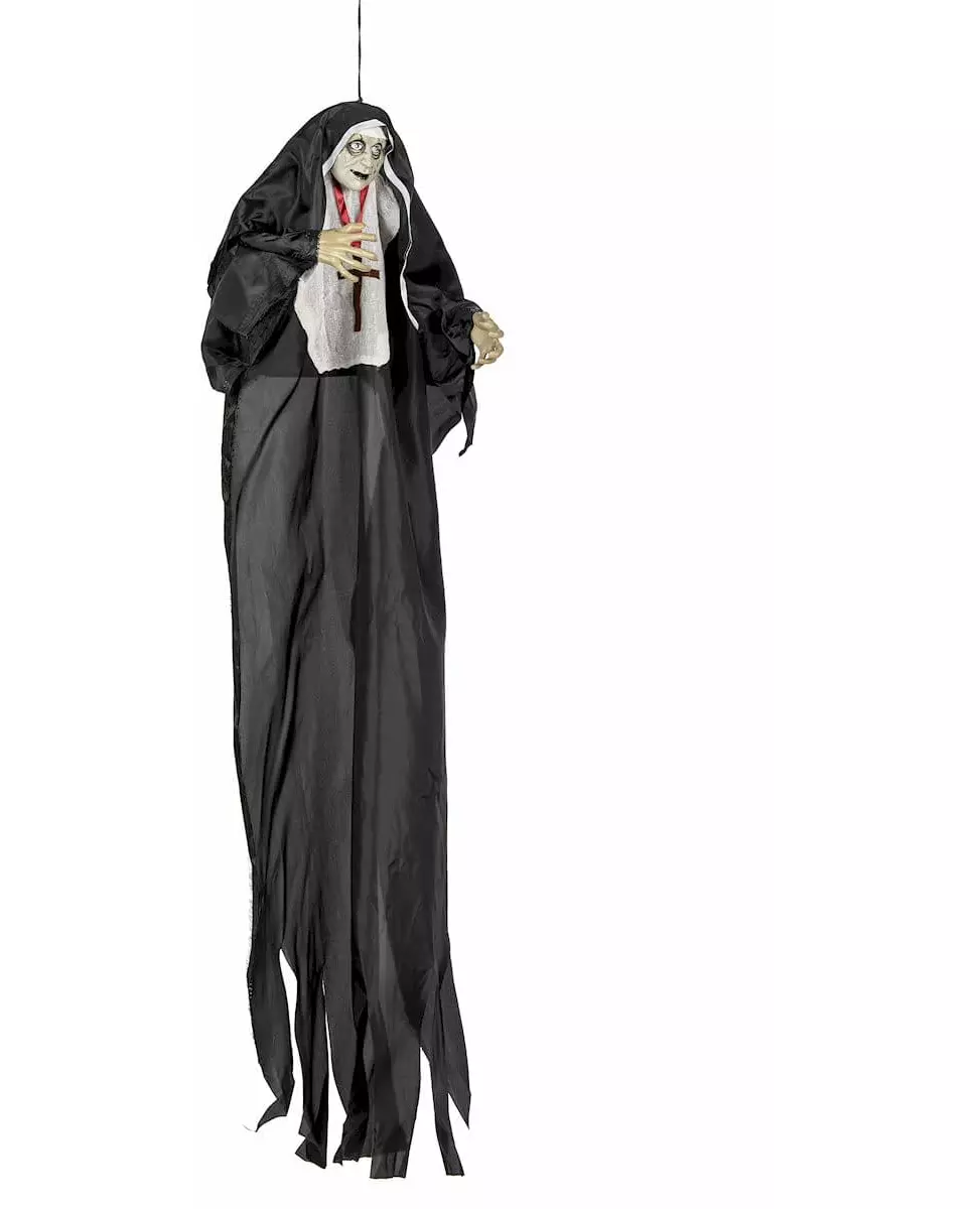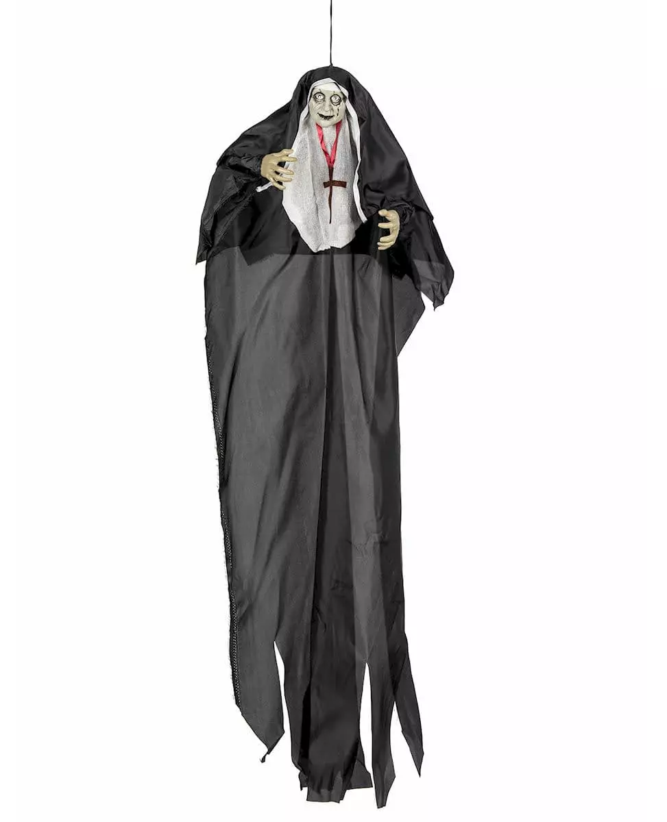 Gå all in med Halloween-dekorasjonene dine. Denne hengende dekorasjonen har en zombienonne. Hun har på seg en svart og hvit drakt og et hodeplagg. Huden hennes er grønnaktig. Hun har også et stort arr i ansiktet. Denne dekorasjonen måler omtrent 137 cm i lengden. Øynene er lysende og blir røde når de slås på. Den bruker 3 LR44-batterier. Den vil være perfekt for å skremme vennene dine så snart de kommer hjem til deg på Halloween-kvelden. Materiale: plast. Inkludert tilbehør: Hengende lampe