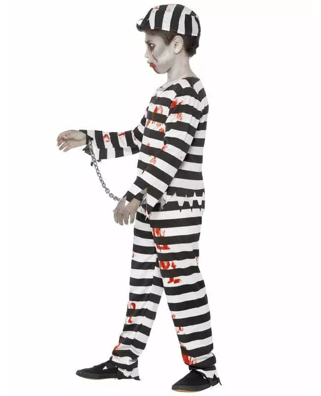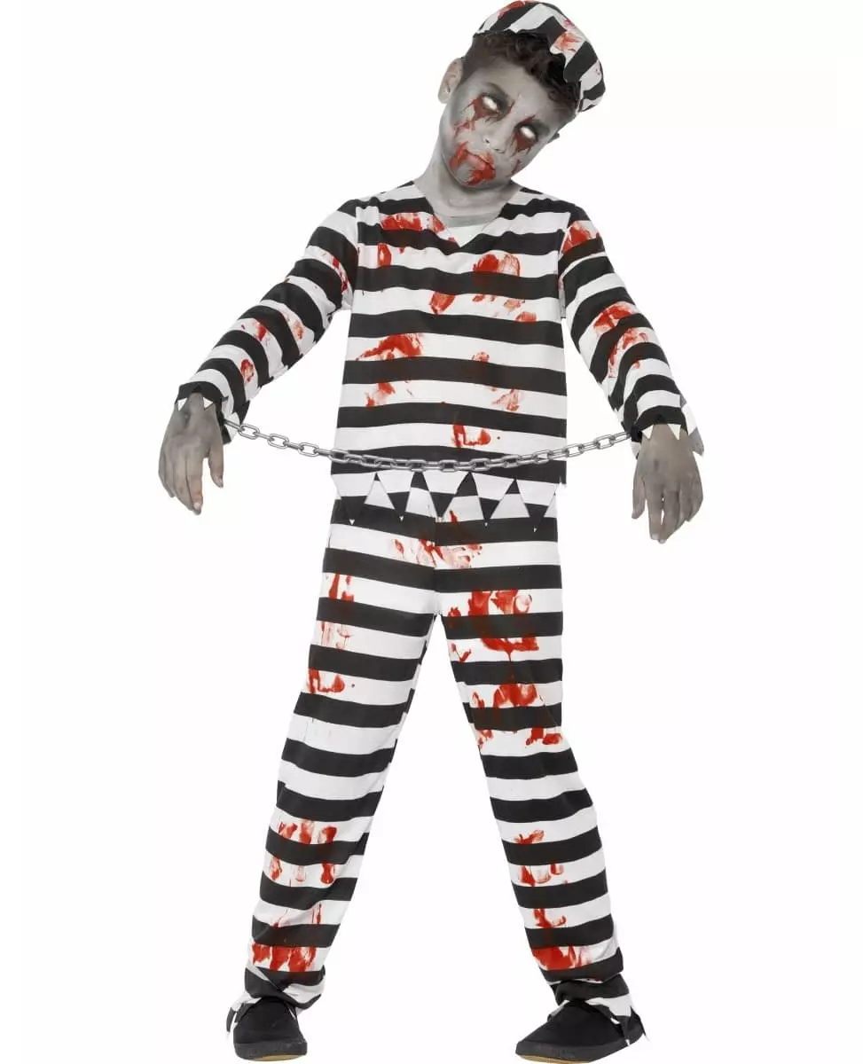Gå ut og hjemsøk fengselsvaktene dine Dette zombiefangekostymet for gutter består av en topp, bukser, en hatt, en kjede og et klistremerkeark. Den svart-hvite stripete toppen er dekket av røde flekker. Den er kuttet i spisser for en slitt effekt. De matchende buksene har en elastisk linning. Den stripete hatten har et spiss snitt på en del av hodeomkretsen. Den grå plastkjeden har to brede strikker i endene. Disse strikkene holdes rundt håndleddene med borrelås. Til slutt vil en plate med klistremerker nummerert fra 0 til 9 la deg lage et registreringsnummer. Dette zombiekostymet vil være perfekt for å rømme fra cellen din og hjemsøke vaktene på Halloween-kvelden. Tilbehør inkludert: Topp Bukser Hodeplagg Kjede Klistremerker Materiale: 100 % polyester Vedlikehold: Håndvask
