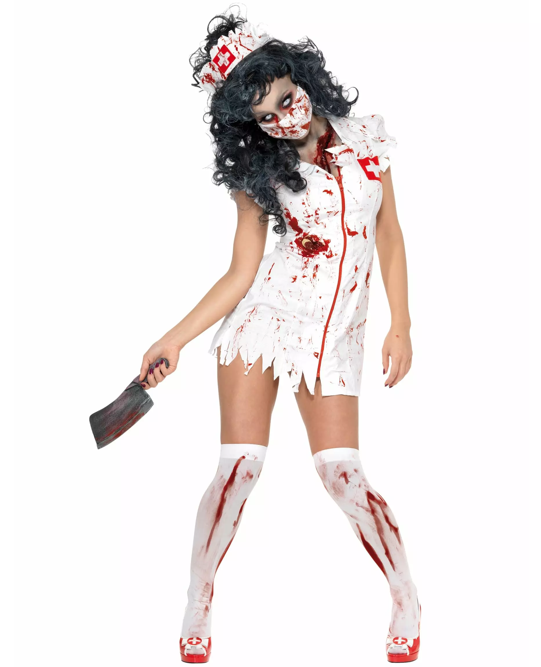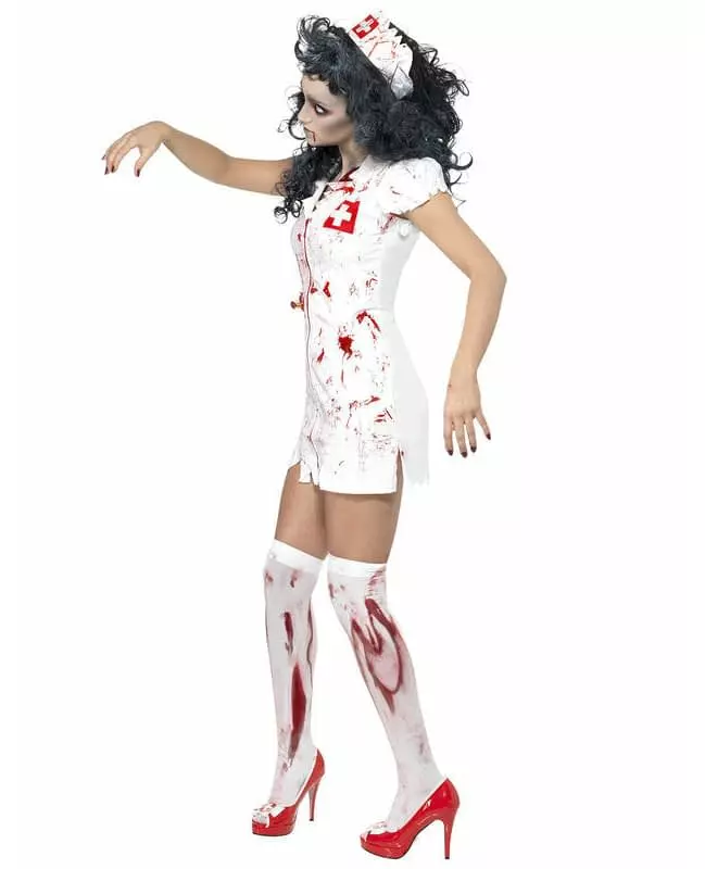 Et blodflekket antrekk! Dette zombie-sykepleierkostymet for kvinner består av en kjole, en maske og et pannebånd. Kjolen er flekket med blod. Den er kort, revet i enden og lukkes med glidelås. Sykepleiermasken og pannebåndet er også flekket med blod. Dette zombie-sykepleierkostymet vil sende frysninger nedover ryggraden til ethvert følge ditt på Halloween-kvelden eller under en av kostymefester. Inkludert tilbehør: Kjolemaske Pannebånd Materiale: 100 % polyester Stell: For hånd