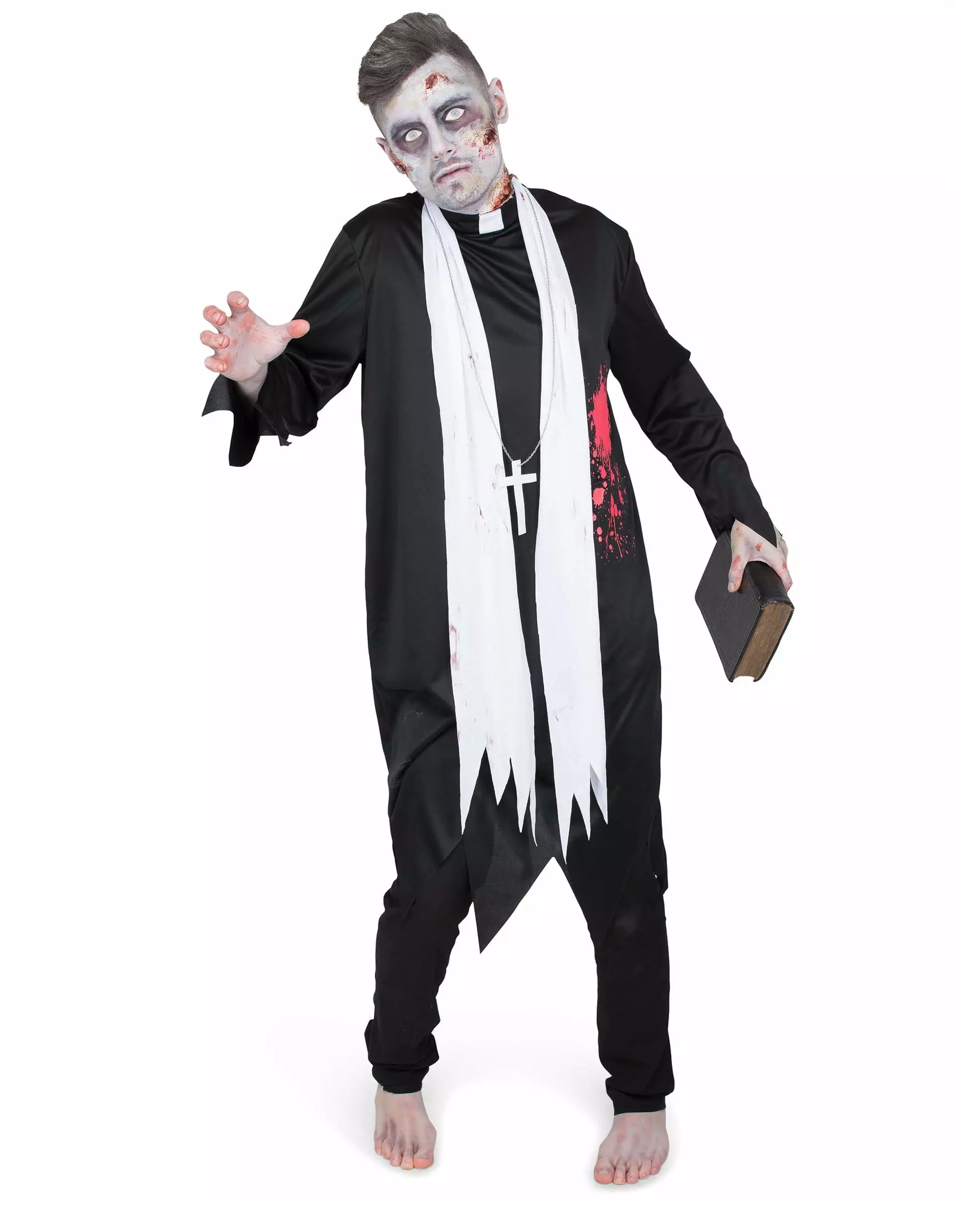 En skremmende prest! Dette zombieprestkostymet består av en tunika, et kors og et skjerf. Den svarte tunikaen er lang og har en krage. Det er falske blodflekker på forsiden. Et hvitt skjerf med falske blodflekker bæres rundt halsen. Og et halskjede med et korsanheng fullfører antrekket. Dette herresettet vil sikre at du er i Halloween-tema på en kostymefest! Inkludert tilbehør: Tunika Korsskjerf Materiale: 100 % polyester Vedlikehold: Håndvask